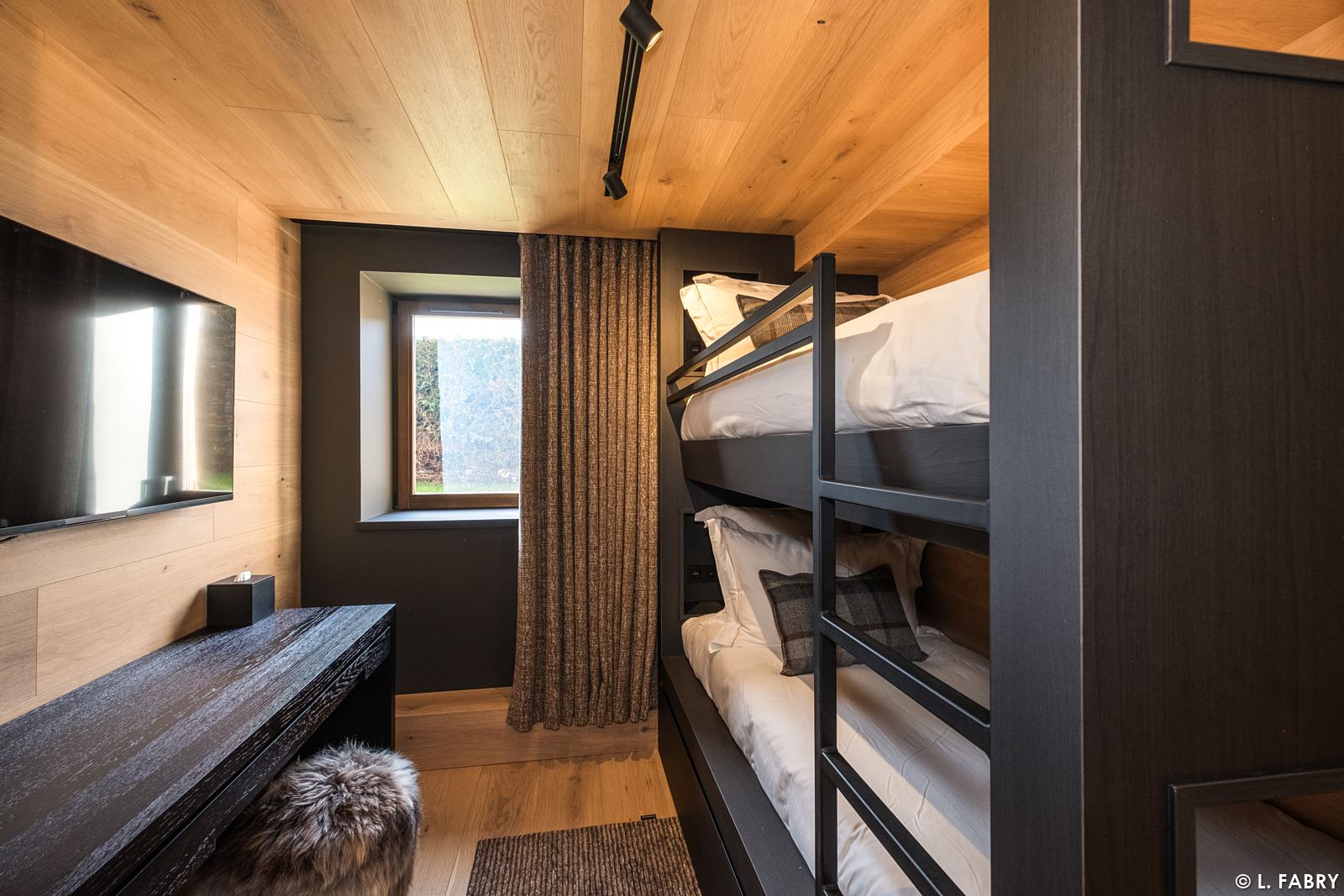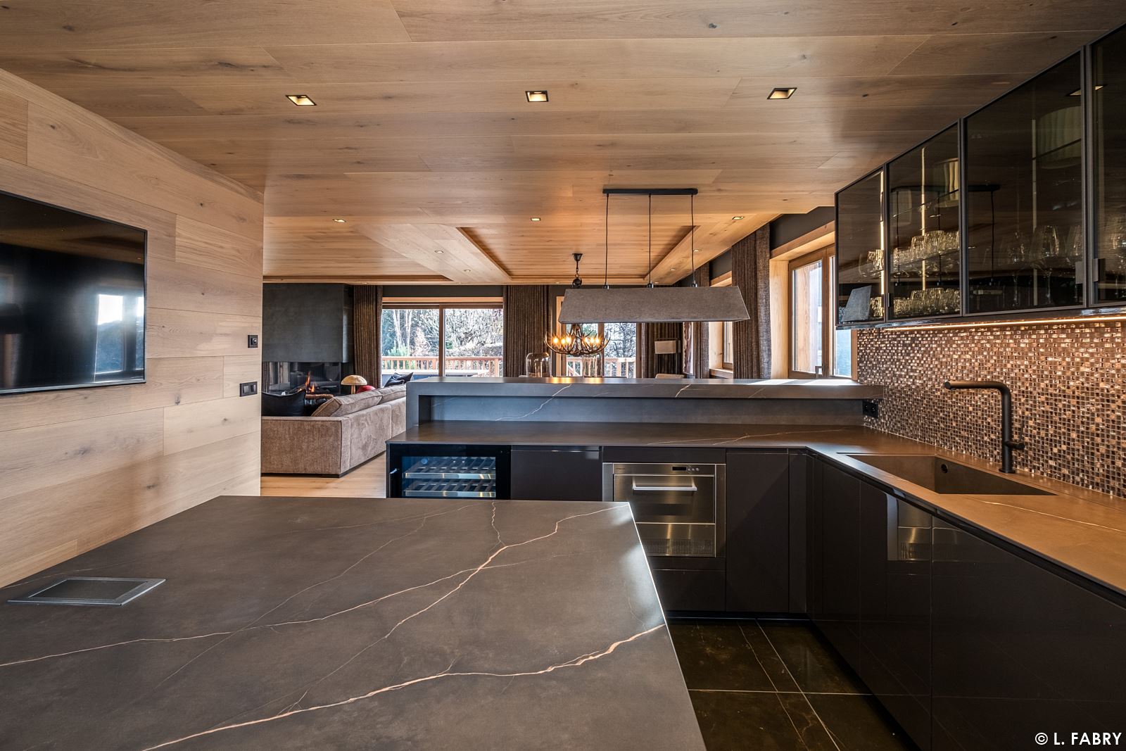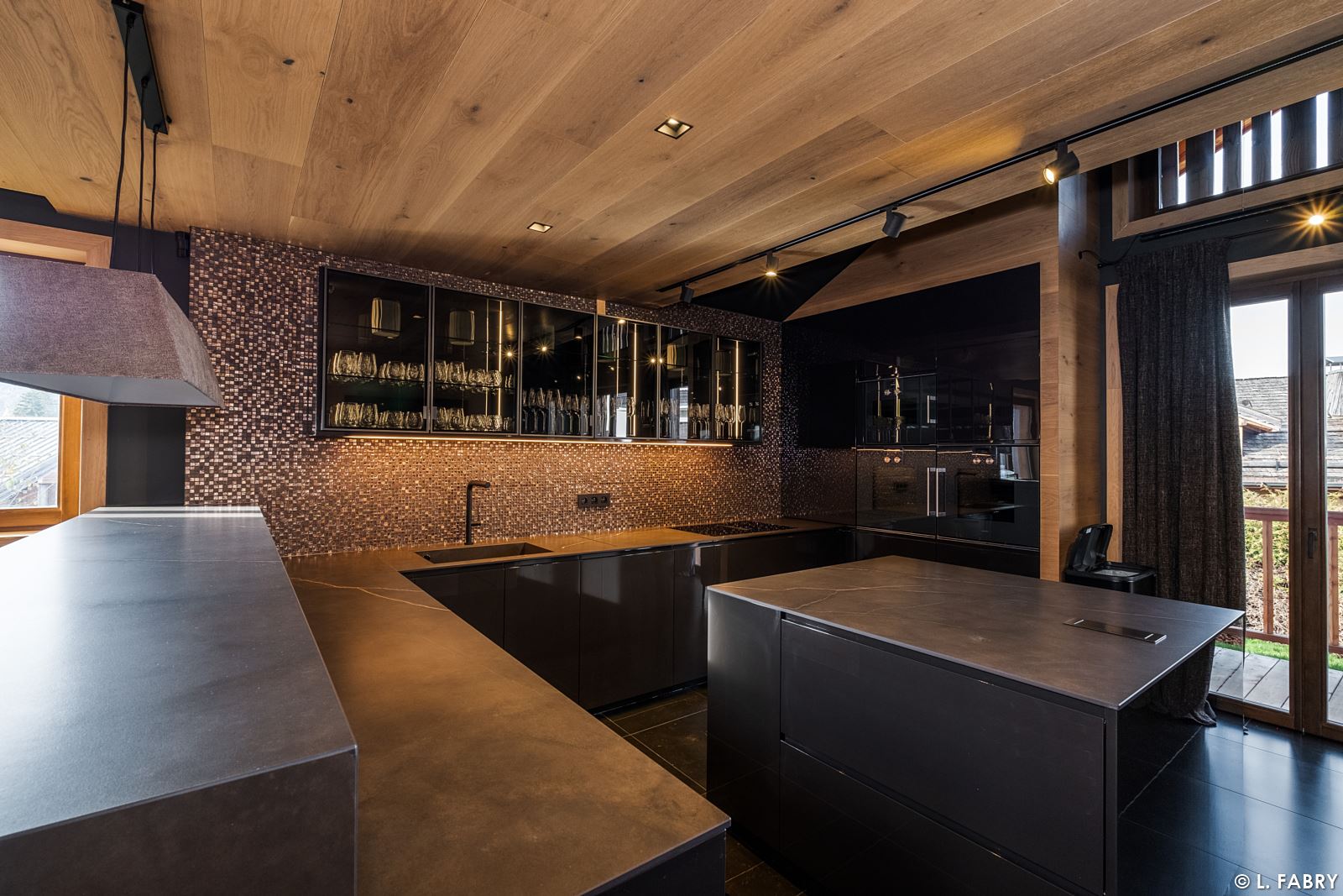 Sur ce chalet, j’ai pu observer les tendances d’architecture intérieure du moment. Notamment beaucoup de sobriété dans la décoration, qui laisse toute la place aux matériaux de construction propres à architecture de montagne. Le bois est par exemple utilisé jusque sur les plafonds. Très présent également, le noir domine dans la cuisine, et sur certains murs. Notamment autour des fenêtres et leurs huisseries en bois clair, ce qui est un bon calcul, pour souligner la vue extérieure. On retrouve aussi des tons très sombres dans le mobilier et les équipements, pour de superbes contrastes, grâce à un éclairage parfaitement réussi. Table à manger, cheminée, tables basses, bureaux, rangements, lampes et lits. Sans oublier le mobilier de jardin.