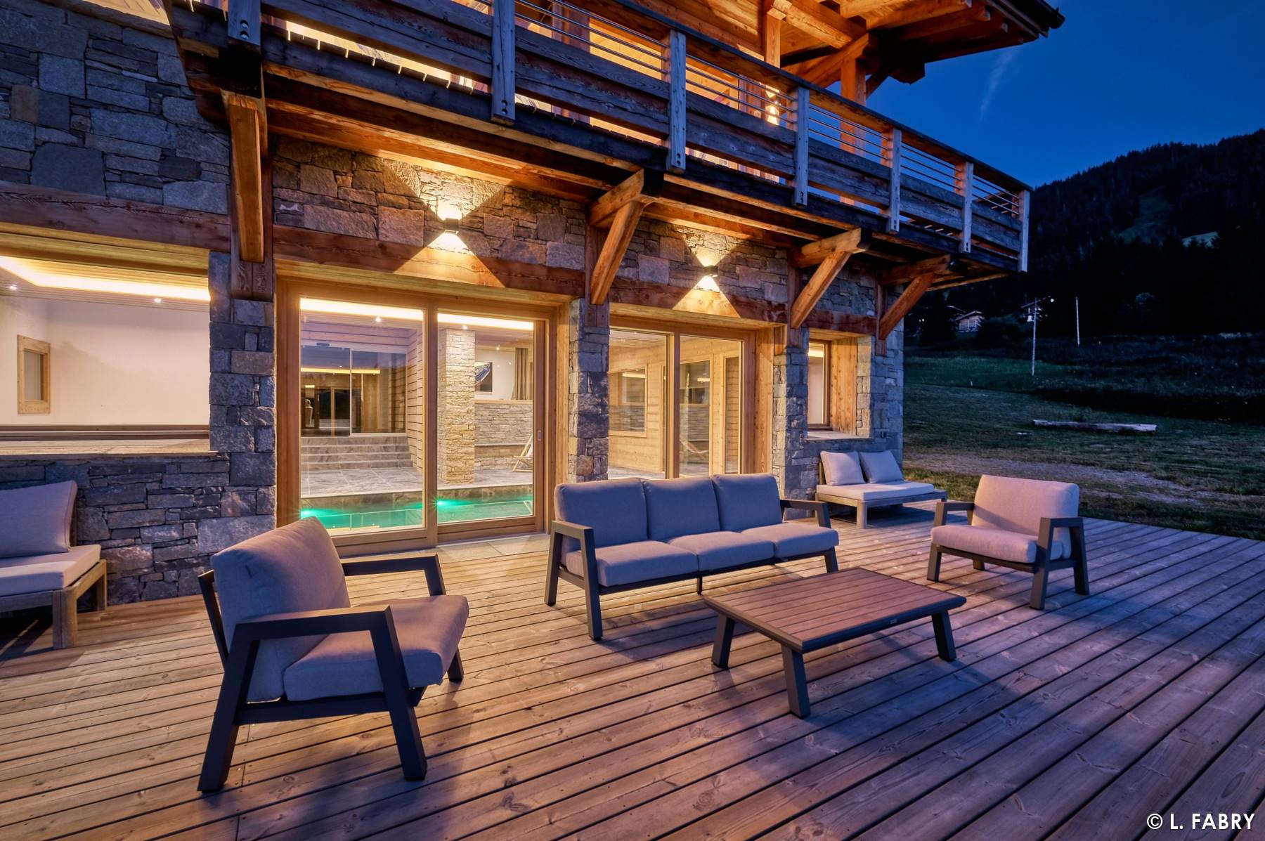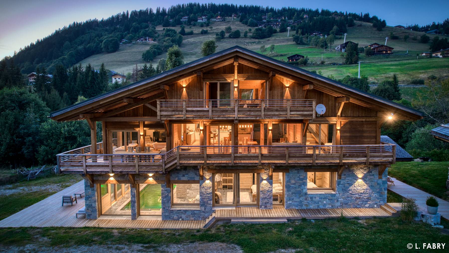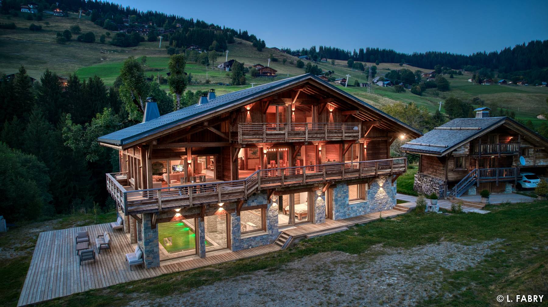 J’ai été sollicité en tant que photographe immobilier dans les Alpes, sur un chalet de luxe dans le Val d’Arly. Celui-ci était situé sur un vaste terrain, entouré de forêt. Au-delà du périmètre, d’un côté, la vue portait vers une partie de la station et ses pistes de ski. De l’autre, c’est vers un panorama exceptionnel sur le Mont Charvin que le regard se tournait. Un environnement sans vis-à-vis, tellement rare que j’ai assez vite proposé de réaliser un second shooting à la nuit tombante…