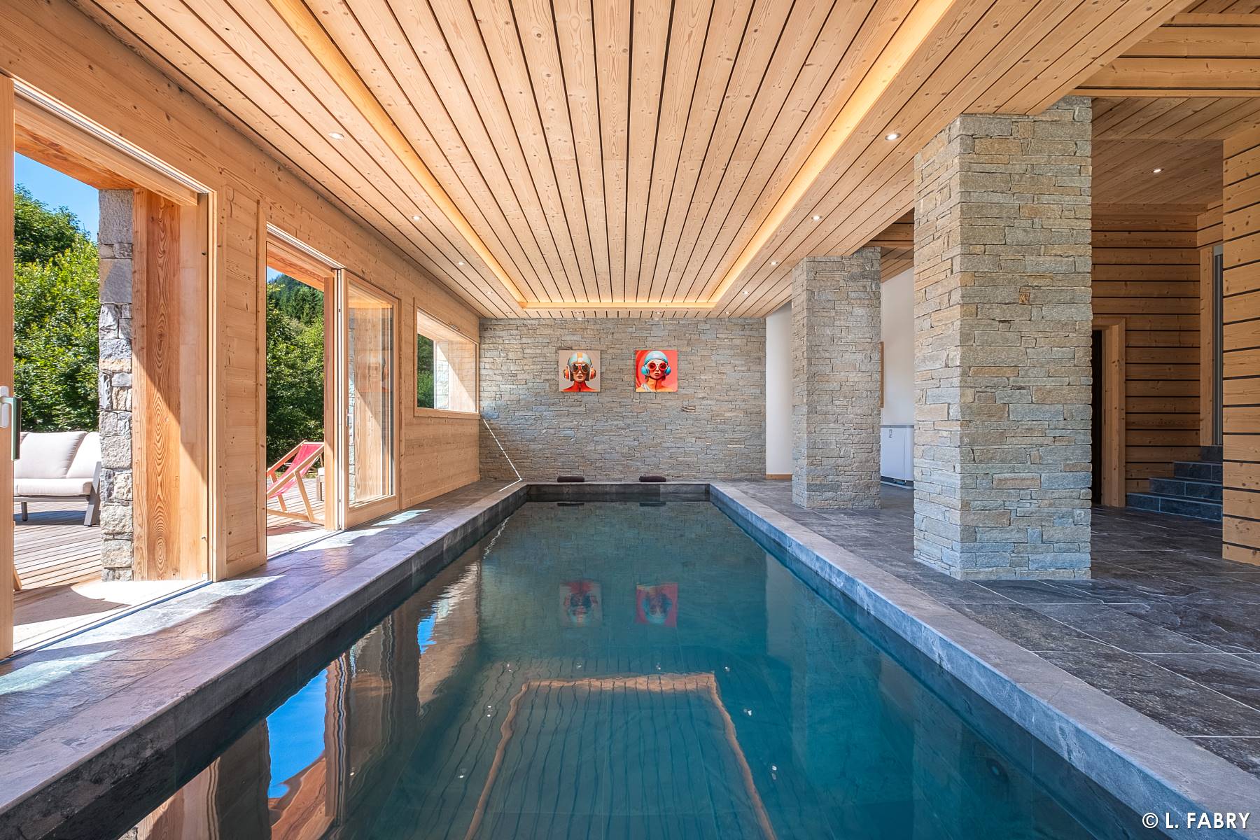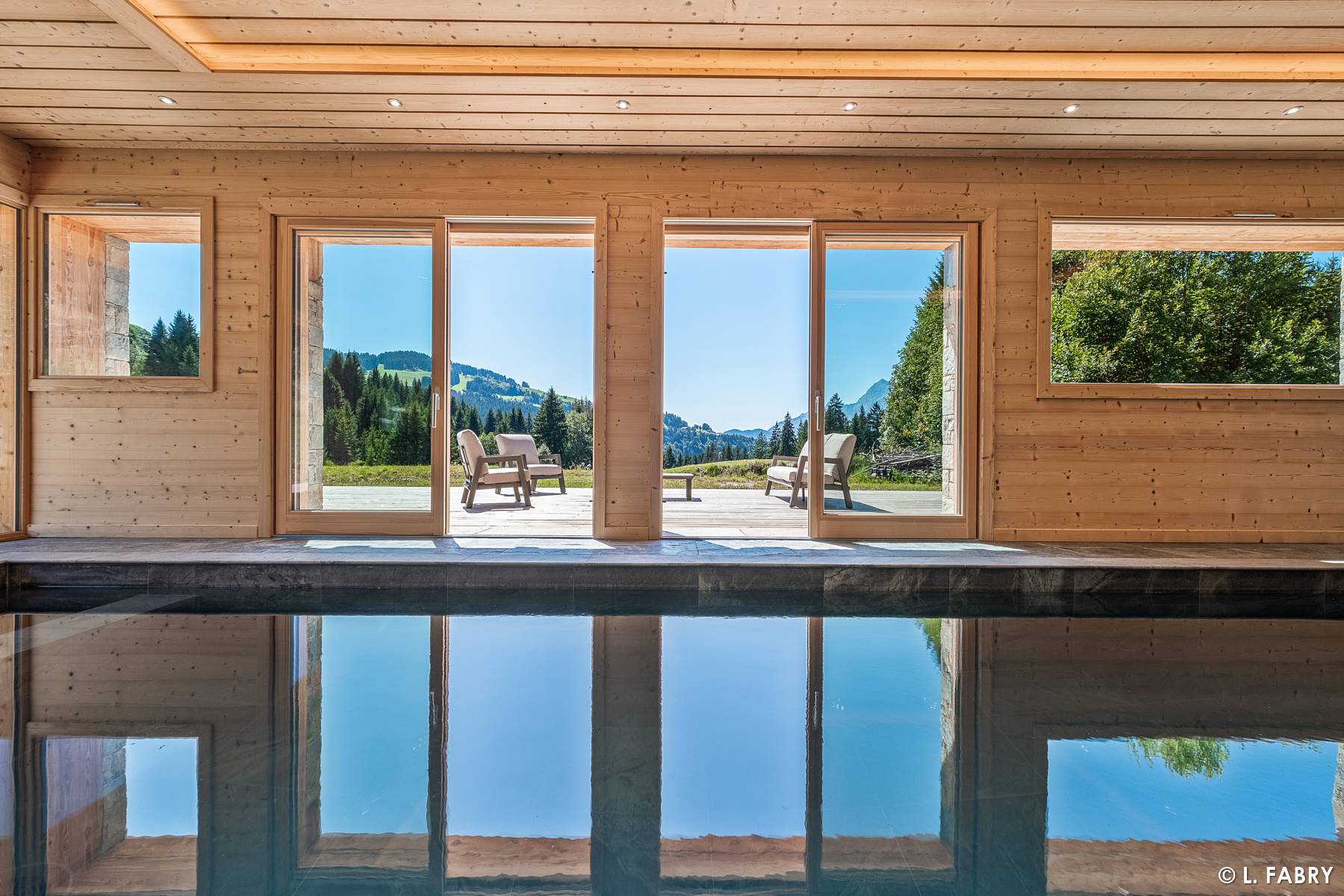 L’intérieur de ce chalet de luxe ne dépareillait pas, avec du mobilier en bois massif, et des volumes absolument spectaculaires. Aussi bien dans la pièce de vie, sur deux niveaux, que dans les chambres, notamment la master, occupant tout le second étage. Au rez-de-chaussée, une piscine laissait admirer le panorama vers l’ouest, avec de grandes ouvertures. Le plus impressionnant, sans doute, est l’omniprésence de la nature tout autour du chalet. Via d’immenses baies vitrées, deux faces de la pièce de vie étaient entièrement ouvertes sur l’extérieur. Comme le racontent parfois les annonces immobilières : expérience immersive garantie, je peux en témoigner !