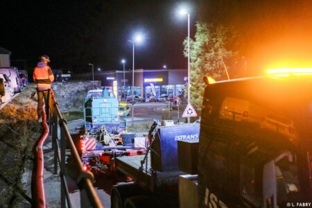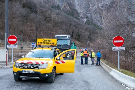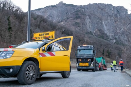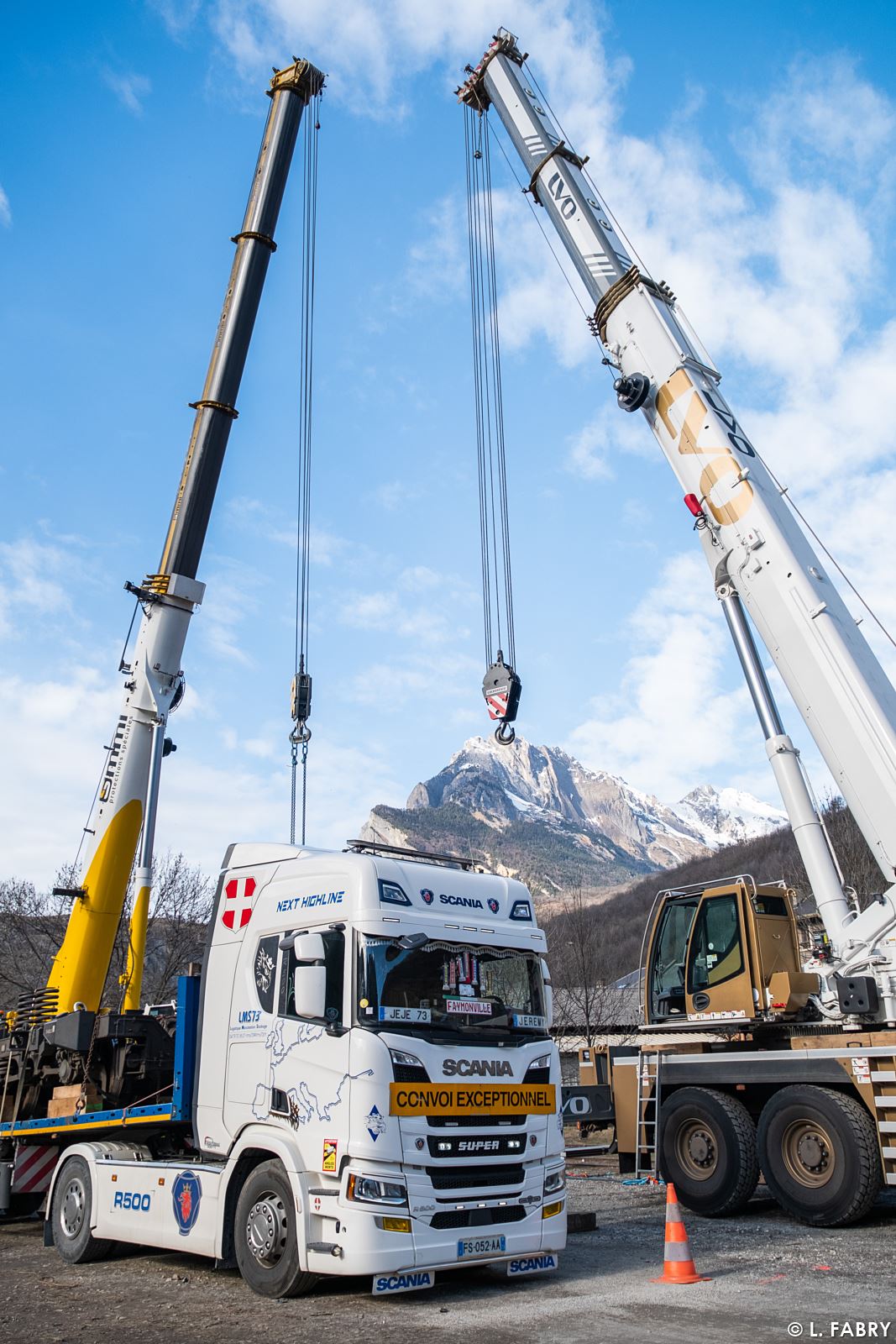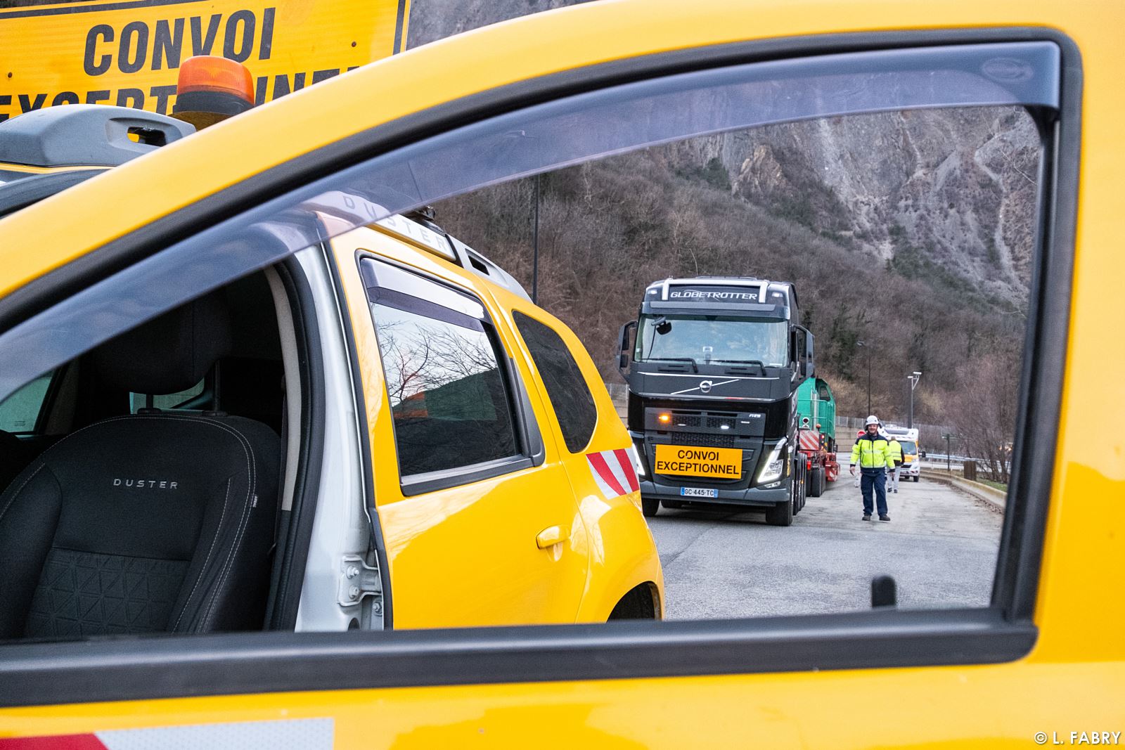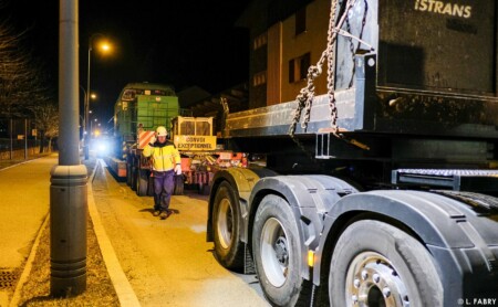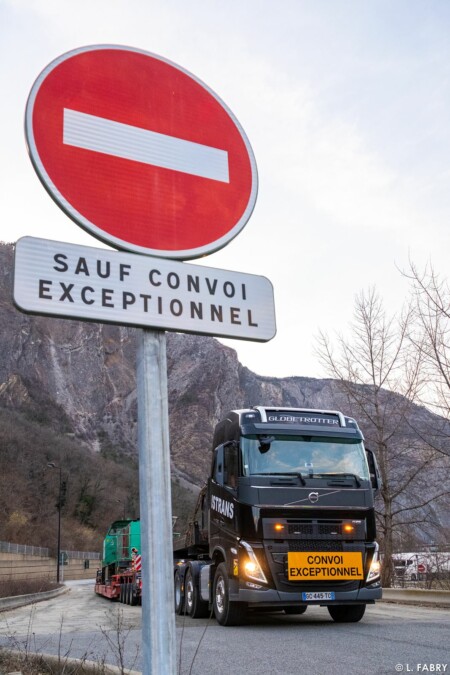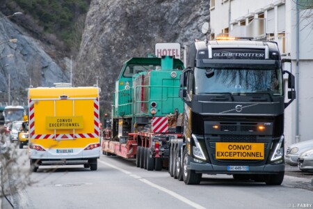 En Maurienne, un convoi exceptionnel a été organisé entre la gare SNCF de Saint-Michel de Maurienne et celle de Modane. Celui-ci a été effectué de nuit, en raison de son impact sur le trafic routier. En particulier, la traversée de Modane fut relativement complexe, à cause de plusieurs ronds points. Lors de leur passage, les essieux doivent d’abord être surélevés, grâce à des groupes électrogènes prévus à cet effet. Une opération délicate à orchestrer, car bien évidemment, un convoi de cette taille ne peut en aucun cas tourner autour du rond point. Le plus souvent, il fait un tout droit, puis le tracteur détache sa remorque, avant de venir atteler à l’autre extrémité pour repartir dans l’autre sens !